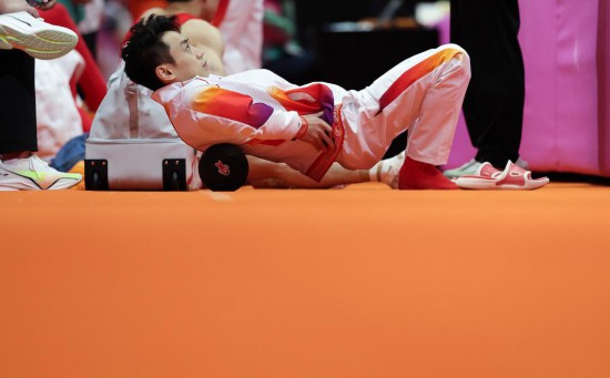 10月20日,邹敬园在男子资格赛双杠项目比赛前热身。新华社记者 白雪飞 摄
