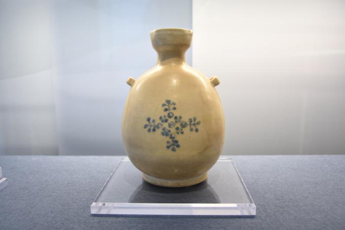 “丝路华章——唐代青花瓷瑰宝展”上展出的唐代青花穿带壶。中新社记者王宇 摄