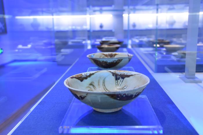 “丝路华章——唐代青花瓷瑰宝展”上展出的代长沙窑青釉褐斑褐绿彩草叶纹碗。中新社记者王宇 摄
