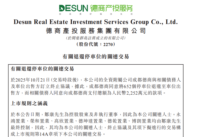 乐居财经 李兰 10月21日晚间,德商产投服务(02270.HK)发布公告,宣布其全资附属公司成都德商与相关债务人及车位出售方订立终止协议。根据协议,成都德商同意将652个停车位退还至车位出售方,相关债务人则同意向成都德商支付总额2252万元的款项。