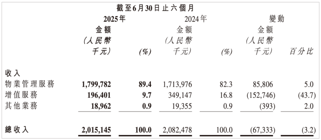 变动较大的是增值服务,期内收入仅1.96亿元,同比骤降43.7%,在总收入中的占比降至9.7%,大幅收缩。卓越商企业解释称,主要是由于“机电安装业务压降”和“租赁经营服务减少”。对此,有行业观察者表示,“这实则暴露了其增值服务模式尚未跑通、过度依赖单一业务线的脆弱性。”