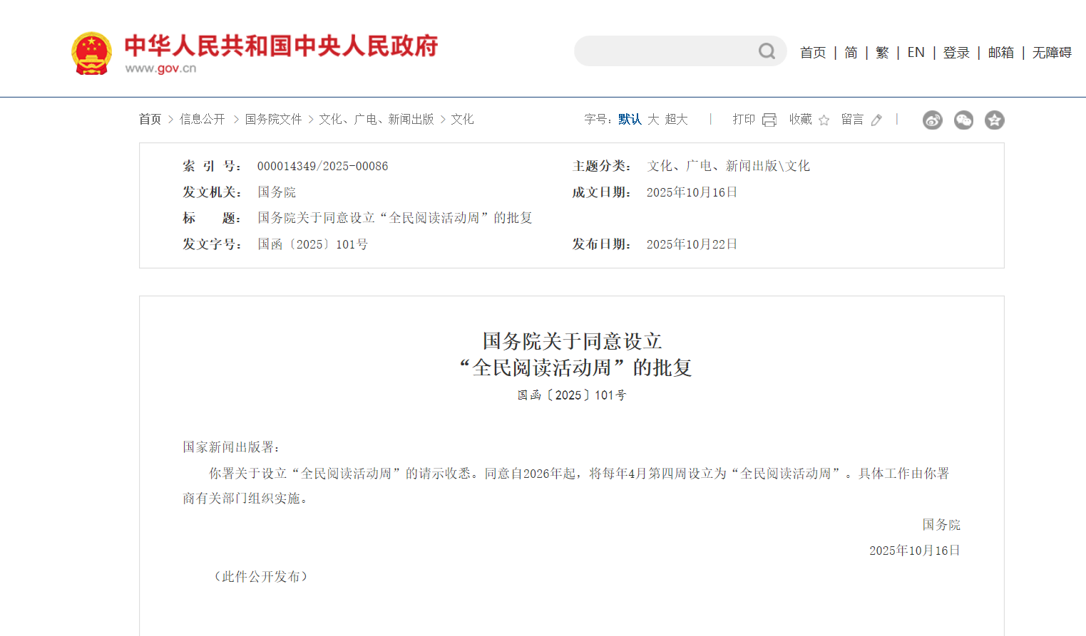 中国网讯 据中国政府网消息,国务院同意自2026年起,将每年4月第四周设立为“全民阅读活动周”。