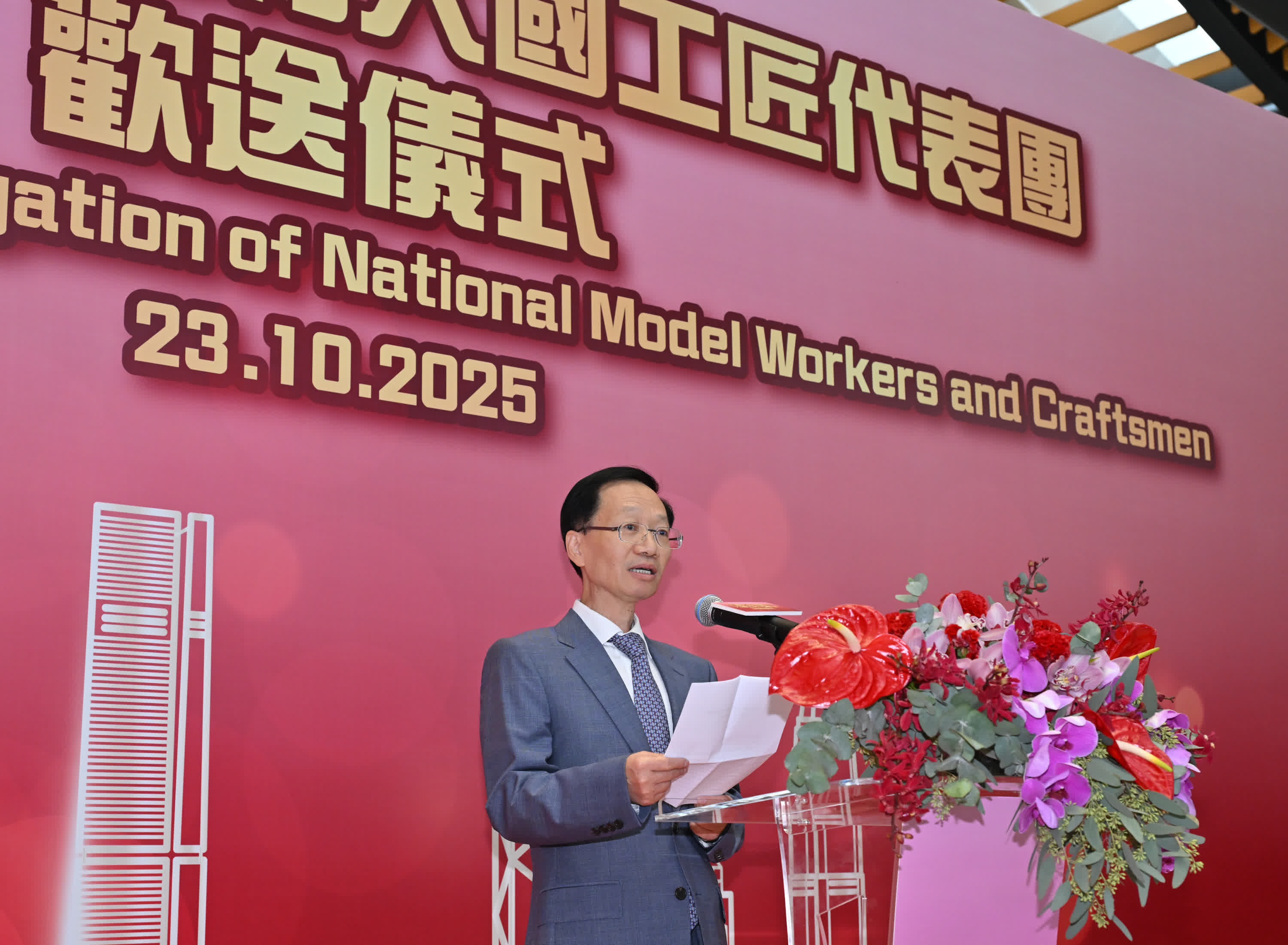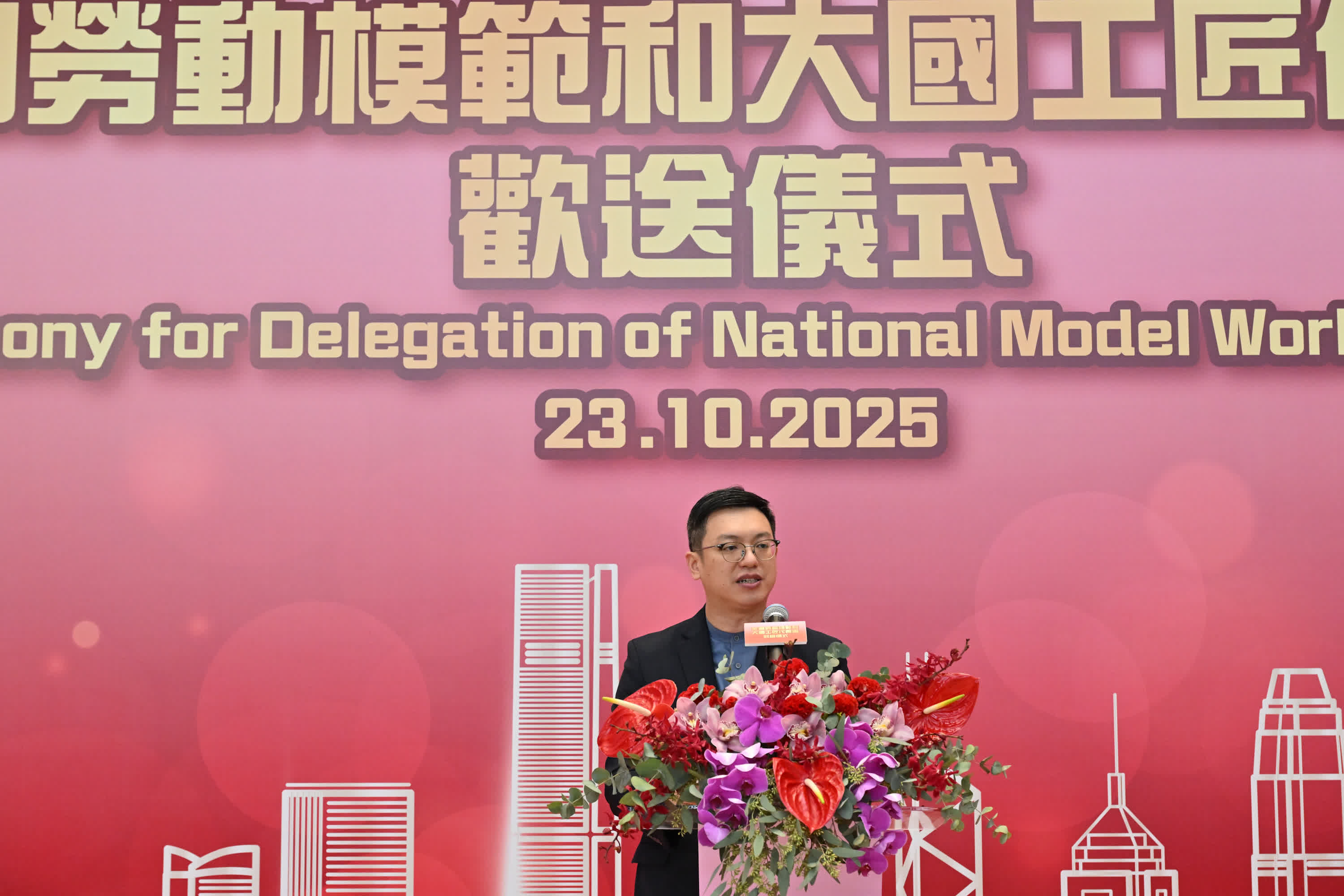 代表團離港前,香港特區政府在港珠澳大橋香港口岸舉行歡送儀式。圖示勞工及福利局副局長何啟明在儀式上致辭。(政府新聞處圖片) 何啟明表示,代表團訪港,讓香港市民親身感受全國勞動模範、全國先進工作者和大國工匠在各自領域中展現的卓越貢獻和崇高精神,進一步體會工匠精神的深刻內涵。他說,代表團成員的專業素養、豐富經驗以及對工作的熱忱,為香港市民,尤其是年輕一代,帶來深刻的啟迪與鼓舞。