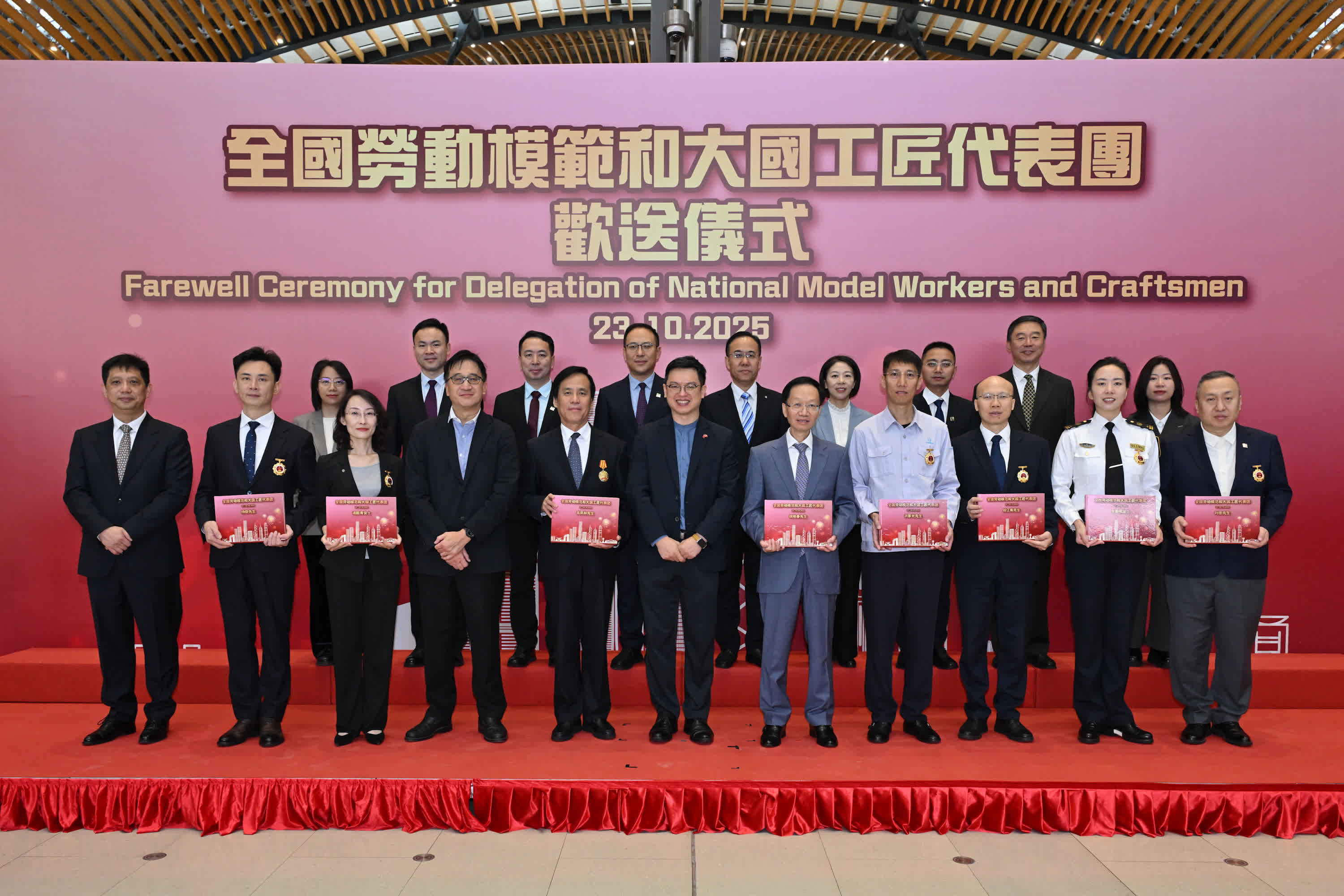 全國勞動模範和大國工匠代表團今日(23日)上午完成四日訪港行程。代表團離港前,香港特區政府在港珠澳大橋香港口岸舉行歡送儀式。圖示勞工及福利局副局長何啟明(前排中)、中央人民政府駐香港特別行政區聯絡辦公室社會工作部副部長吳小玔(前排左一)和勞工處副處長(勞工事務行政)何錦標(前排左四)與代表團團長、中華全國總工會副主席魏地春(前排右五)及其他代表團成員在歡送儀式合照。(政府新聞處圖片) (政府新聞處影片) 香港文匯報訊 全國勞動模範和大國工匠代表團今日(23日)上午完成四日訪港行程,今日離港前往澳門訪問。代表團離港前,香港特區政府在港珠澳大橋香港口岸舉行歡送儀式。勞工及福利局副局長何啟明在歡送儀式上衷心感謝代表團訪港。