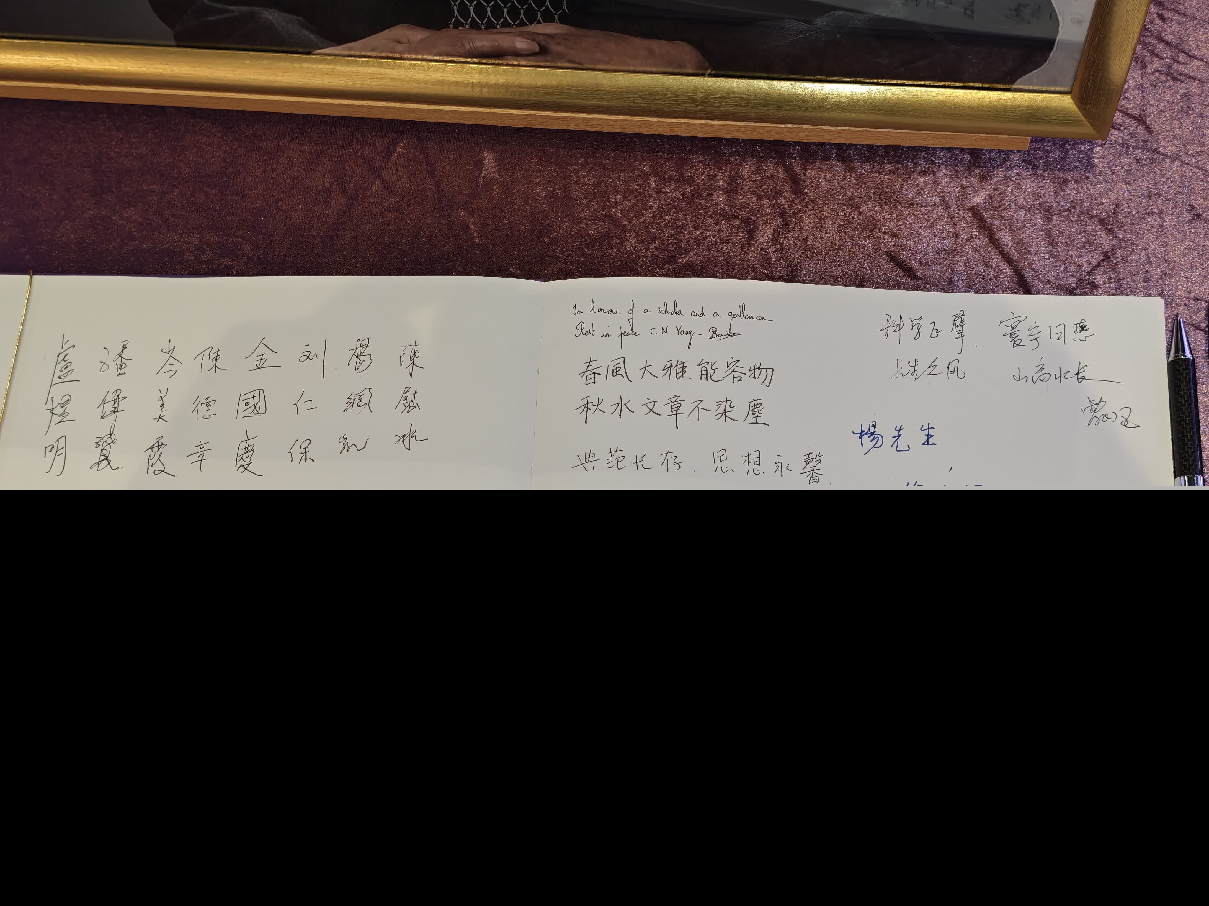 曾在中大物理系執教超30年、現已85歲的榮譽院士陳方正回憶,他和楊振寧已是相識近40年的老朋友,指楊振寧的研究在基本物理學理論的進步上起到了決定性的作用。他引用孟子的「充實而有光輝之謂大」形容楊振寧教授的一生,讚他是「一個真正的偉人」。在遺照前,他留言寫道,「楊先生,你已經過完了光輝而充實的一生,但你開闢的道路還要有無數的人走下去。我們曾經共度的那許多美好時光,我也將永久銘記於心,你好好安息吧。」
