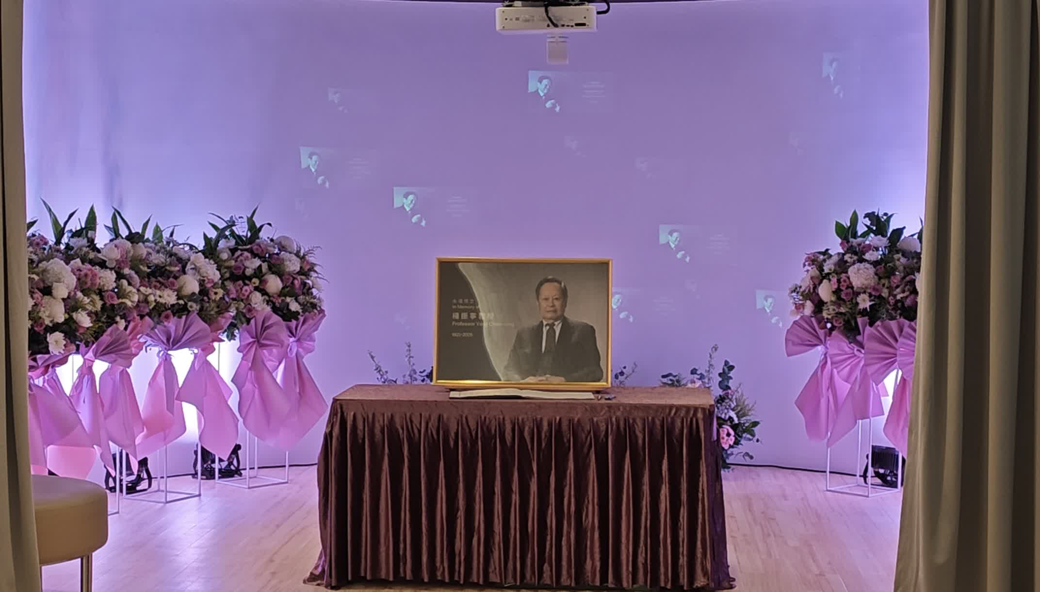 弔唁室於今早9時起正式開放,正中擺放楊振寧教授的遺像,並寫道「永遠懷念 楊振寧教授 1922-2025」。弔唁室兩側各置8個花圈,中間的多媒體屏幕投影着他的生平事跡與各項成就。大公文匯全媒體記者在現場見到,陸續有市民前往弔唁室向教授鞠躬致敬,並在遺像前寫下留言以此緬懷。