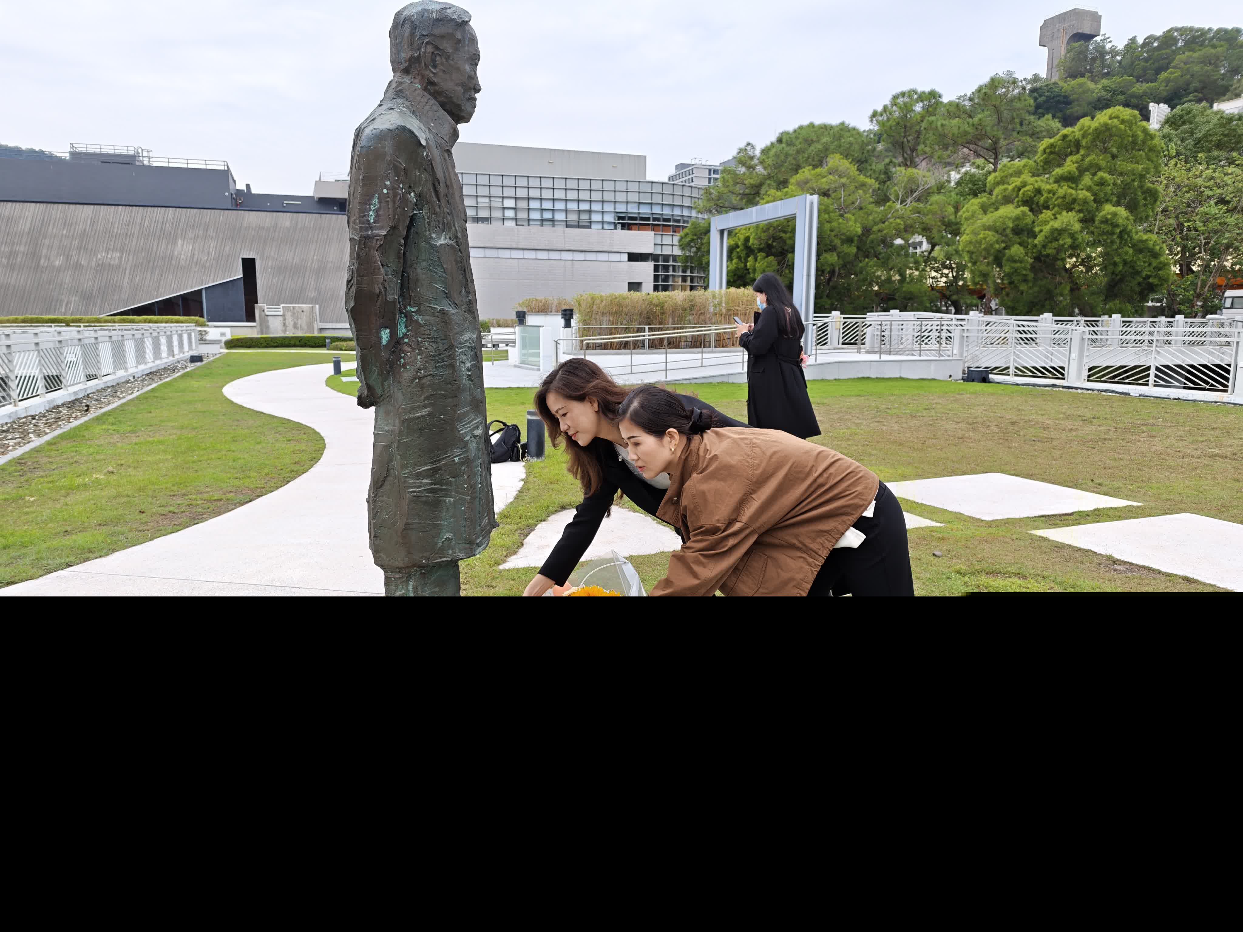 在弔唁室不遠處的邵逸夫夫人樓天台花園草坪上,屹立着中大於2007年為楊振寧榮獲諾貝爾獎50周年暨85歲生日而揭幕的銅像,雕像腳下簇擁着鮮花。浙江工業大學的曹飛鳳老師今年以訪問學者身份來到香港中文大學學習。她和她的朋友在得知弔唁室開放後,便從家邊街市購買鮮花,特地帶到雕像前獻上。她指自己也有國外留學經驗,對楊振寧教授在當時國內條件並不算優渥的情況下,毅然決然回國的精神感到感動,表示這是每一個在國外研究的學子的心愿,值得所有人學習。