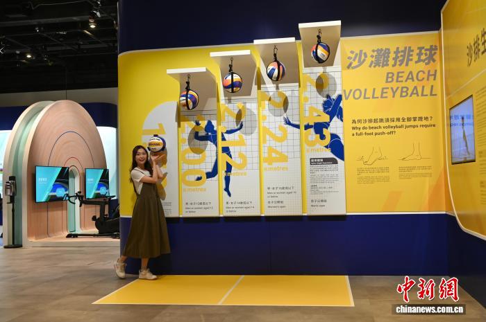 10月23日,香港科学馆举办“国家发展成就系列──臻至完美:运动与科学的交汇”展览,展示全国运动会的历史及第十五届全国运动会香港赛区的赛事项目。图为一名女士体验沙滩排球项目,了解运动员的跳跃高度。 中新网记者 李志华 摄