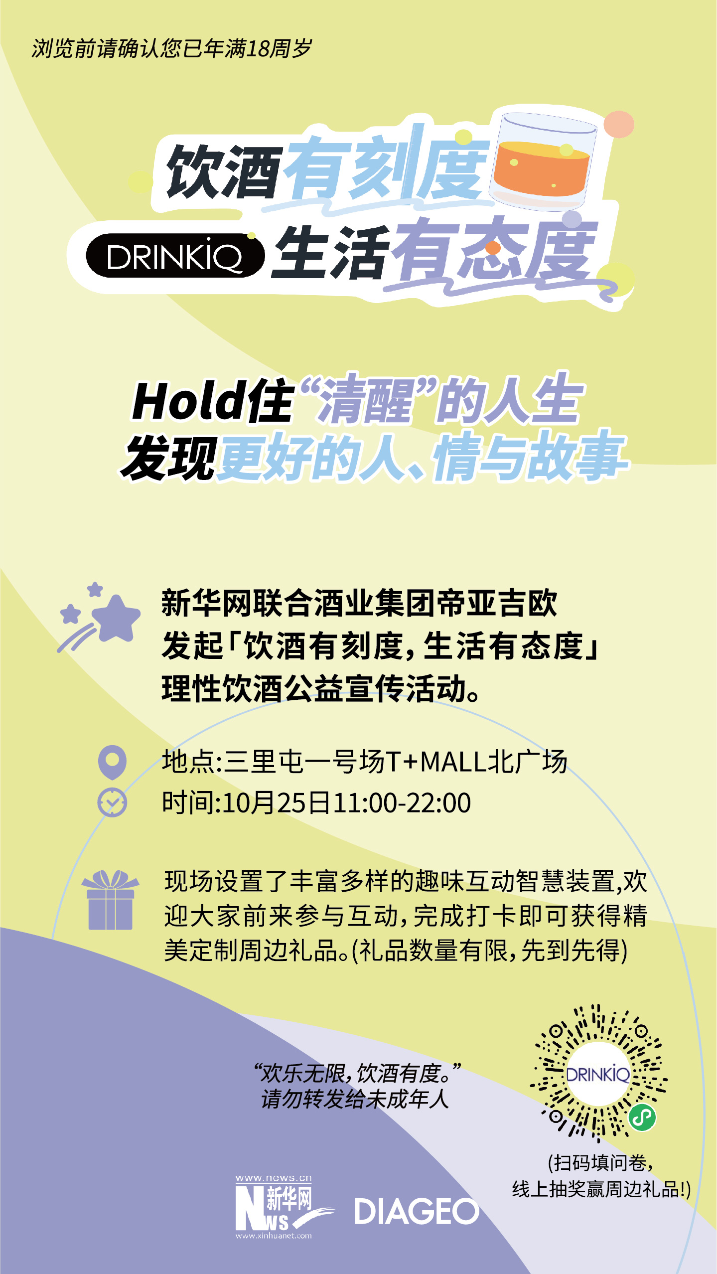 10月25日,新华网联合全球知名跨国酒业集团帝亚吉欧发起的“饮酒有刻度,生活有态度”理性饮酒公益宣传活动,将落地北京三里屯,通过一系列丰富、有趣的互动体验项目,与参与者一同感受“理性饮酒”的生活方式。