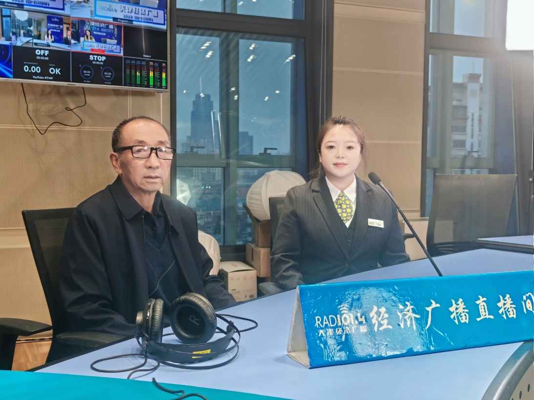 万科物业天津第四分公司总经理邓森旗(右)、新颐园居民代表张女士(左)电台直播间合影