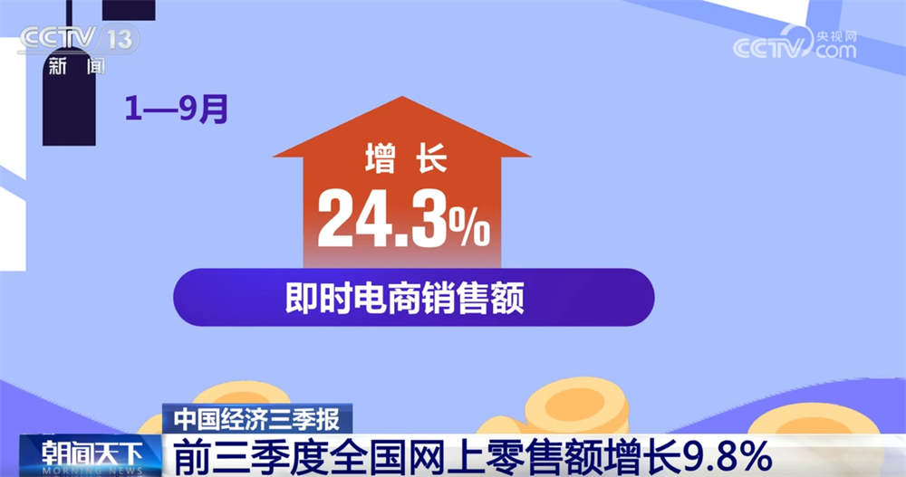 网络零售持续激发消费活力。数字产品、线上服务、即时电商成为亮点,据商务大数据监测,1—9月,手机、电脑等数字产品网零额增长8.3%,线上服务消费增长20.2%,即时电商销售额增长24.3%。