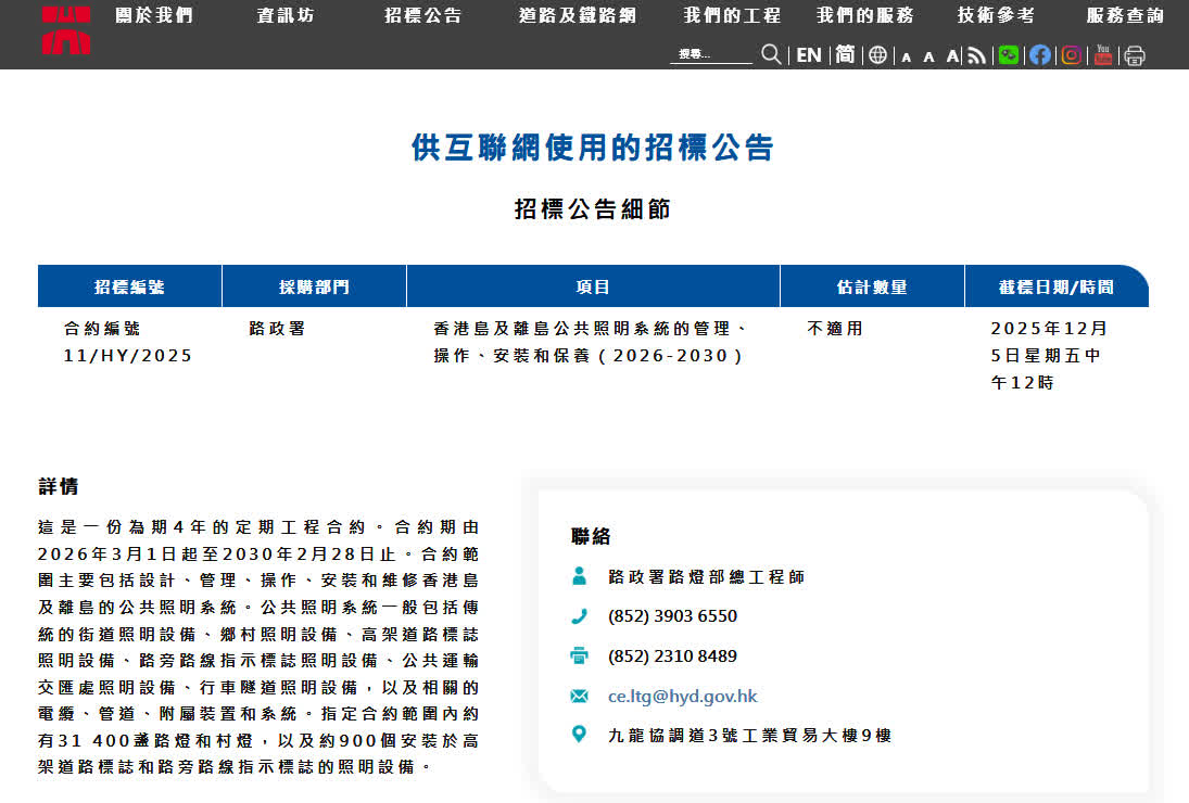 路政署今日(10月24日)為香港島及離島公共照明系統招標承投一份為期四年的管理、操作、安裝和保養的定期工程合約(合約編號11/HY/2025),合約期由2026年3月至2030年2月。