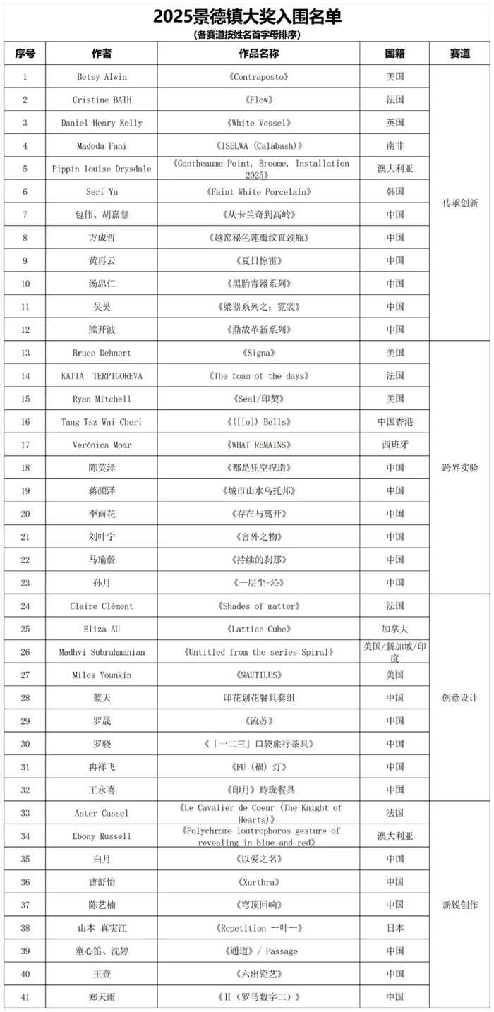2025年10月17日,作为中国美术学院与陶文旅集团联手发起的“世界手工艺术星图计划”的重要实践模块,首届“景德镇大奖”在景德镇陶溪川大剧院揭晓。首届“景德镇大奖”由世界手工艺理事会(WCC)、国际陶艺学会(IAC)、景德镇创意设计中心的共同发起。大奖旨在打造一个促进全球陶瓷创新发展交流与合作的高规格平台,吸引世界各地的艺术家、收藏家、设计师、博物馆和艺术爱好者的关注,逐步使“景德镇大奖”成为全球手工艺术的风向标。